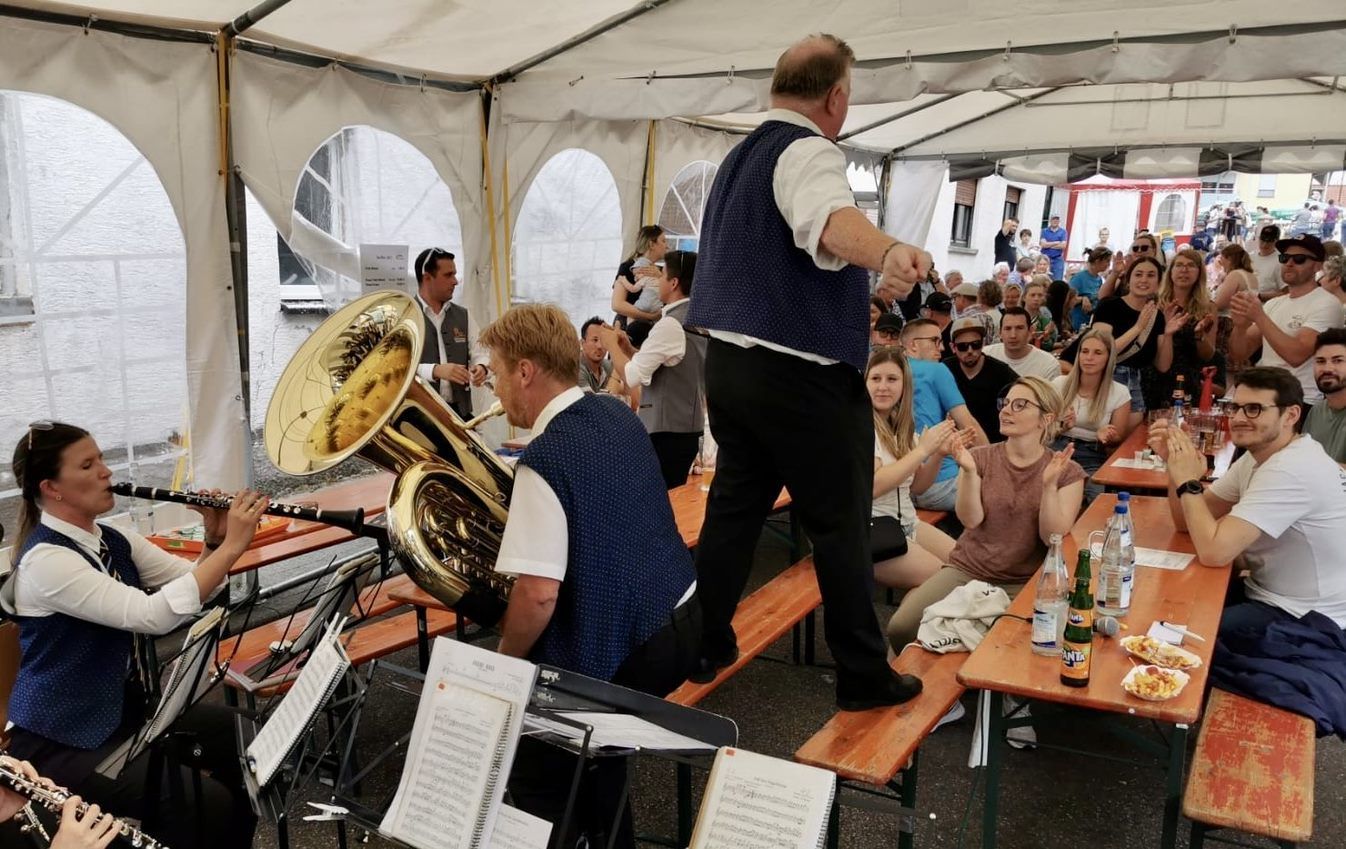 So gab die Stadtkapelle ordentlich Gas und heizte den Gästen musikalisch ein. Das Feuer sprang über und es herrschte eine grandiose Stimmung im Festzelt. Die Trachtenkapelle Eschelbach und insgesamt die Eschelbacher erwiesen sich als hervorragende Gastgeber und man hatte sich nach kurzer Zeit fest ins Herz geschlossen.